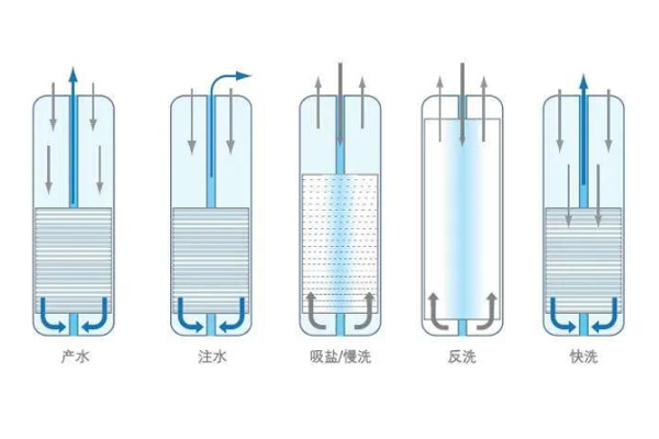 快洗(正洗)(Fast Rinse): 用进水快速自上而下冲洗树脂,彻底清除残留的盐水和被置换出来的钙镁离子,直至出水硬度/电导率达标。此步骤耗水较多。