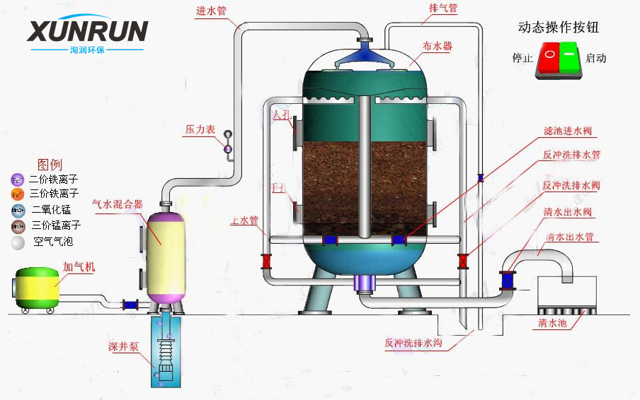 2 、自己打井水源发黄,通常的原因是水中含铁离子或锰离子超标,导致水源变成黄色或者红色,带着一股铁腥味。大家所处的地方水中的铁锰离子含量过高,地下水源的铁元素是二价铁,水打起来与空气接触形成三价铁(因二价铁在地下的时候不和空气接触,不会发生变色,接触空气之后就会显黄色),所以在把地下水源打上来过一会就会发黄,这种地下水源一般都是含铁离子和锰离子过高,不能饮用,这个时候一般会采用洵润环保的除铁锰设备过滤之后才能喝。 自来水公司集中供水发黄的主要原因是: