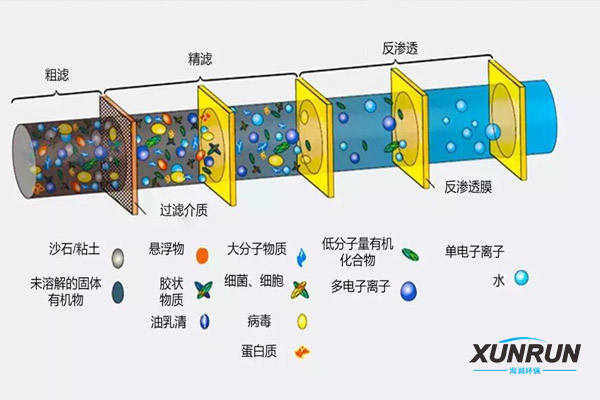 反渗透水处理设备主要基于反渗透(RO)技术这种高效的水处理方式,反渗透技术是一种通过膜过滤技术来分离溶质和溶剂的方法,通过在膜两端施加压力,将自来水压过反渗透膜,在膜的高压侧将水中的有害离子和细菌等分离出来,达到高效净化处理水的目的。反渗透水处理设备的工作原理可以从三个方面来解释: